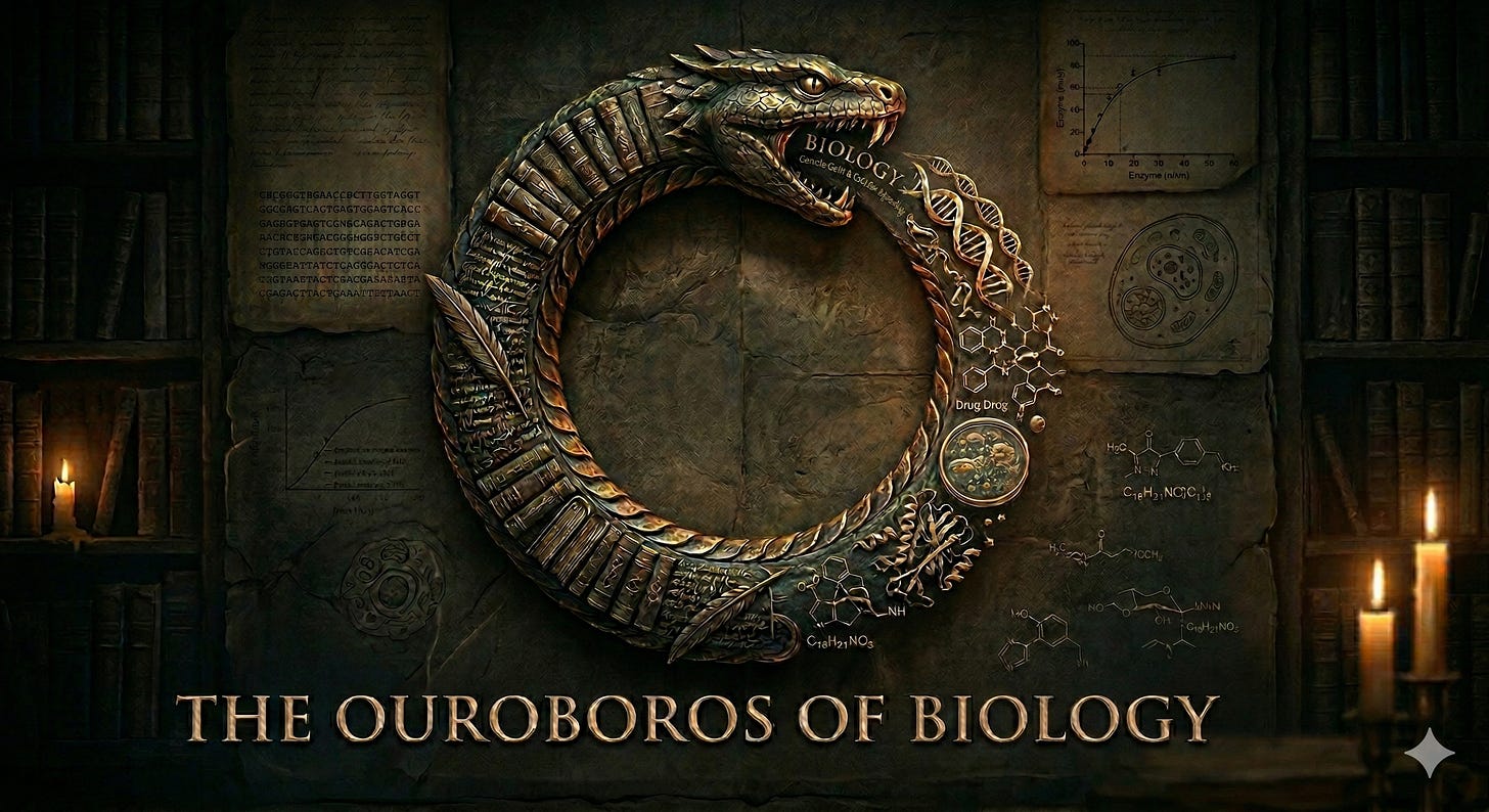 We train models on the published record of biology, then ask them to generate the next frontier of biological insight from that same record. That is the Ouroboros. A system trying to escape the limits of consensus by recursively consuming consensus. But the published record is not biology.